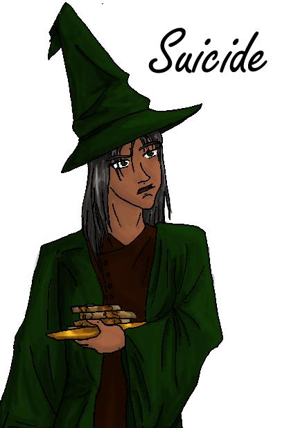 | Just when you thought it couldn't get better, Cedar Copse goes and colors her marvelous Suicide pic! Yes, your daily dose of scary Greek guy with cinnamon toast is now in full color, complete with forest-green Hogwarts robes and a matching hat. Sadly, conversion to .jpg format has somewhat dulled the lustre of the original, but it's still a great picture. Everybody go worship Cedar now. DO IT! Back to Artwork Back to the Response Center? |
