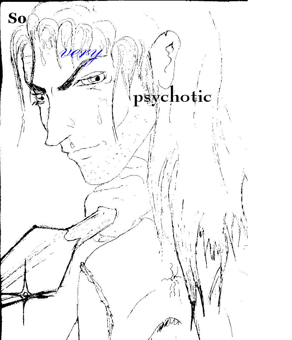 | An idealized portrait of Agent Suicide, created when I hadn't had nearly enough sleep. His right hand is holding the shaft of a "darning needle," the short javelins which he used as weapons in his home continuum. His left eye is twitching rather worrisomely. Suicide is a canon character, recruited from Steven Pressfield's "Gates of Fire." He spent most of his life wanting to die, but now he wants to live- live for revenge on all Mary Sues. Nobody's exactly quite sure why he hates them so much, but one thing's for sure: when this man gets That Look in his eye, it's better to be someplace else. Preferably Mexico. Back to the Response Center? Back to Artwork |
