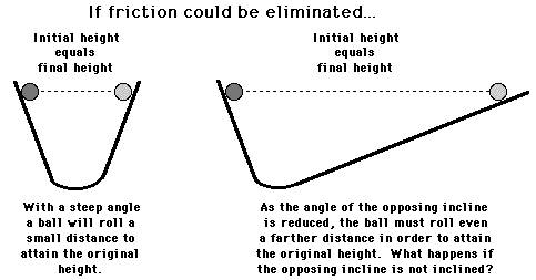 Galileo, the premier scientist of the seventeenth century, developed the concept of inertia. Galileo reasoned that moving objects eventually stop because of a force called friction. In experiments using a pair of inclined planes facing each other, Galileo observed that a ball would roll down one plane and up the opposite plane to approximately the same height. If smoother planes were used, the ball would roll up the opposite plane even closer to the original height. Galileo reasoned that any difference between initial and final heights was due to the presence of friction. Galileo postulated that if friction could be entirely eliminated, then the ball would reach exactly the same height.