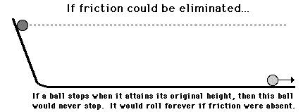 Galileo's reasoning continued - if the opposite incline were elevated at nearly a 0-degree angle, then the ball would roll almost forever in an effort to reach the original height. And if the opposing incline was not even inclined at all (that is, if it were oriented along the horizontal), then ... an object in motion would continue in motion....