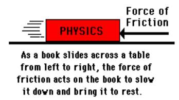 Isaac Newton built on Galileo's thoughts about motion. Newton's first law of motion declares that a force is not needed to keep an object in motion. Slide a book across a table and watch it slide to a rest position. The book in motion on the table top does not come to a rest position because of the absence of a force; rather it is the presence of a force - that force being the force of friction - which brings the book to a rest position. In the absence of a force of friction, the book would continue in motion with the same speed and direction - forever! (Or at least to the end of the table top.) A force is not required to keep a moving book in motion; in actuality, it is a force, which brings the book to rest.