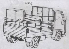 (b)   Furniture carried by a lorry normally is tied up together by string. When the lorry starts to move suddenly, the furniture are more difficult to fall off due to their inertia because their combined mass has increased.