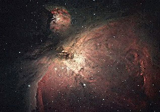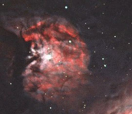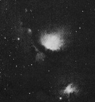 M42 มีชื่อว่าเนบิวลาสว่างใหญ่เป็นเนบิวลาเรืองแสงที่พอมองเห็นได้ด้วยตาเปล่า มีความสว่างปรากฎประมาณ 4.0 อยู่ห่างจากโลกประมาณ 1,500 ปีแสง เนบิวลาที่อยู่ด้านบนใกล้ๆกันคือ M43 |