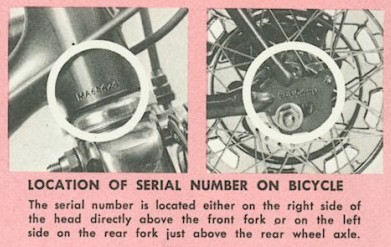 Chicago built Schwinn serial numbers for the years 1960 - 1969 are found on the left rear axle-hanger or fork-end on the frame; for the years 1970 - 1979 (Chicago built) they are on the headtube of the frame where the fork enters from the bottom (actually, this begins in April of 1970). The Chicago serial numbers consist of a letter representing the month of manufacture, a number indicating the last digit of the year (1960 - 1964; 0=1960, 1=1961, etc.) or a letter indicating the year (1965 - 1979; A=1965, B=1966, etc.), followed by a sequential series of five or six digits (e.g. A367584 or CB77584). If letters were used for date codes, they skipped the letters "I" and "O" as they looked too much like numbers. Note: This scheme is for all Chicago built non-Paramount models excluding 1962-1963 Superiors, 1964-1969 Super Sports and 1968 S/S Tourers (whose serial numbers are located on the left rear axle hanger and consist of a single letter code for the month [again, skip "I" and "O"], the last digit of the year and a 3-digit sequential build number -- e.g. 'K6018' is the 18th frame built in October of 1966). The 1970 Super Sports with Huret dropouts seem to have used a two digit year ('C70204' -- March, 1970, 204th frame). The 1979 Chicago built Le Tour and Super Le Tour models had their serial numbers on the left rear axle hanger and began with an 'S', followed by the standard letter/number scheme. Bicycles from Japan will have serial numbers located on the left, rear axle hanger, on the bottom bracket shell or on the lower section of the headlug. The number will have a production month letter in either the first or second position and a production year number in the other (first or second) position. Examples: J677123 = September, 1976. For some Japanese built Schwinns the headbadge will have a 4-digit stamping that represents the assembly date and consists of the ordinal day and the last digit of the year (2456 decodes to the 245th day of 1976 or 1986 -- use decals and components to determine the decade). The ordinal dating was adopted for Schwinn's domestic production in 1976. Some Japanese bikes may have an 'X' in the month position of the frame serial number. This was used to keep the physical year of production, for example 'X9' -- December of 1979, with the model year of the remainder of the production for that model -- 1980. This could also work for January back to a previous year. Some Taiwanese (built by Giant) Schwinns have a date code (on the right rear axle hanger or on the bottom bracket shell) in the format 'Gmmyy'. The letter "G" followed by a two-digit month code (01 = January etc.) and two more digits for the production year (80 = 1980 etc.). An example would be 'G0680' and equates to "Giant, June, 1980". Japanese built LeTour (and Super LeTour) numbers (1978) include the letter "S" with a letter for the month of production and a single digit for the year of production (8 = 1978). Example: SC84652 decodes to March, 1978.