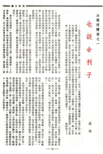 舍利子本來只有兩顆﹐是謝先生從南洋帶回來的﹐是一位高僧送她的釋迦牟尼舍利子﹐兩顆舍利子大小如豌豆仁﹐顏色灰白﹐略似陳舊的法瑯質﹐又像象牙珠﹐並無很多光澤﹐看來並無若何特出的﹐但是每隔一個時候﹐它們就增加數目﹐隔了幾個月﹐我去揭開一看﹐居然有了四顆小小的的舍利珠﹐在兩顆原來的母珠週圍。這些小珠﹐還會長大,幾個月以後就長到有如母珠大小﹐真是不是眼見﹐不敢相信。 到底是什麼緣故﹐舍利子會繁殖﹖謝先生也請教過不少學者﹐其中也不乏生物學家﹐却仍然未獲得一個滿意的解釋﹐我也為此翻閱過一些書籍。印度古籍中倒是頗有提及﹐不少述說舍利子的繁殖﹐一位印度友人抄了一大串書名來給我﹐可惜搬家丟了一大批書籍﹐連它也找不到了﹐將來只有從頭來找證據。 謝先生說等此次舍利子再繁殖以後﹐她會給我幾顆﹐我這一次一定要拿去那一中間有名的生物學院好好請人研究一下﹐到底它是什麼構成的﹖謝先生說送給人的有些能再繁殖﹐大多都不能。只有虔誠奉佛之家的才能﹐我怕到了我手上﹐也是不會繁殖的了﹐像我這樣的猴兒性情﹐還要打算送它去科學研究﹐委實是不虔誠。不過﹐我認為有尋根問底的必要。 謝家的舍利子﹐並非我僅見的舍利子。我多年前陪同舊金山佛禪學會的兩位馮博士兄弟在台北參觀佛寺﹐馮氏昆仲是佛禪會的創辦人﹐他們發動了佛教信徒﹐從一無所有之情形之下﹐買了一座破房子﹐大家出力﹐把它修建成今日的宏偉五層大樓﹐建立了一座佛教圖書館。馮氏昆仲是美國土生華僑﹐不大懂中文及普通話﹐由我陪同參觀及為之翻譯﹐我們在中國佛教會的數位主持法師安排之下﹐訪問了許多間佛寺及僧院﹐多得我都記不清﹐我只記得有一處是西藏活佛駐錫之所﹐是否法號為章嘉活佛﹖我已記不清楚了﹐那時我剛二十歲﹐孩子氣未脫﹐對於佛教也缺乏認識﹐我被挑上陪馮氏昆仲﹐不過是因為我能說幾句英文、能說淺淺薄薄的國語而已﹐懂得什麼佛理﹖去參觀﹐也就是等於小孩子看風景名勝﹐弄得清什麼﹖ 總之﹐我就是糊裡糊塗地帶了馮氏昆仲﹐還有幾位美國佛徒﹐去參拜活佛的錫所﹐那房子外表是普通人家﹐裡面却是佛堂﹐參拜以後﹐主持人恭敬地捧出活佛的舍利子來讓我們瞻仰﹐那是我第一次見到佛家舍利子。當時見到就是一愣﹐翻譯不上來﹐還是馮氏昆仲自己看到﹐用英文來告訴我那是什麼﹐主持人似是藏胞﹐說的國語口音我又有些聽不懂﹐比手劃腳﹐彼此弄了大半天﹐我才知大概。 那位活佛的舍利子是供奉在一隻精美的盒子之內﹐我看見盒內絲緞上滿處是各種形狀大小不一的小珠子﹐有些是灰白﹐有些白色﹐有些是綠色的﹐也有些是黃色的。暗綠色的一種﹐狀如剝了果皮的桔子﹐有一瓣一瓣﹐大小只有一顆人造珍珠那麼大﹐小的只有黃豆那麼大。主持人告訴我﹐說這是活佛在臺北火化以後的舍利子。一共有一千七百多粒,而且還時常在增加之中。 當時我就問怎麼會增加呢﹖主持人的回答不大明瞭﹐我以為他未聽懂我的“廣東國語”﹐而且馮氏昆仲的參觀時間表又忙得很﹐馬不停蹄﹐趕著要去看他處﹐所以我也就不再多問。 這是在見到謝先生寓所的舍利子之前的事。 後來在謝寓出入﹐才後悔自己未能多向那位西藏法師請教﹐一個年青人﹐巴巴的再跑去叩問﹐恐怕也難獲得接見賜示﹐所以我也沒有再去請教。 以後常聽說有些俗家居士奉佛虔誠修持有恆的﹐焚化後亦或多或少有舍利子發現﹐到底舍利子是什麼物質﹖就不是淺薄無知如我者所可得知了。我若獲得舍利子﹐我無疑是要將它送去給科學研究的。相信這種研究﹐只有幫助世人更加明瞭佛教之深奧。 (拋磚引玉﹐希望能見到學者發表有關舍利子研究的讜論。)