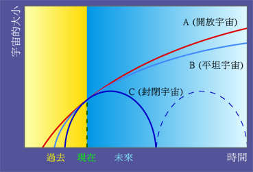 在標準的大爆炸學說模型內,認爲是物質的密度(Density of matter) 决定宇宙最後的命運(Ultimate