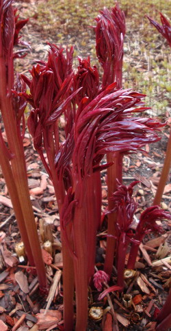 萌芽 攝於2009年4月30日 破土茁長至四呎高開花 (見圖),只需三十多日,芍藥的颷長速度,教人瞠目結舌!