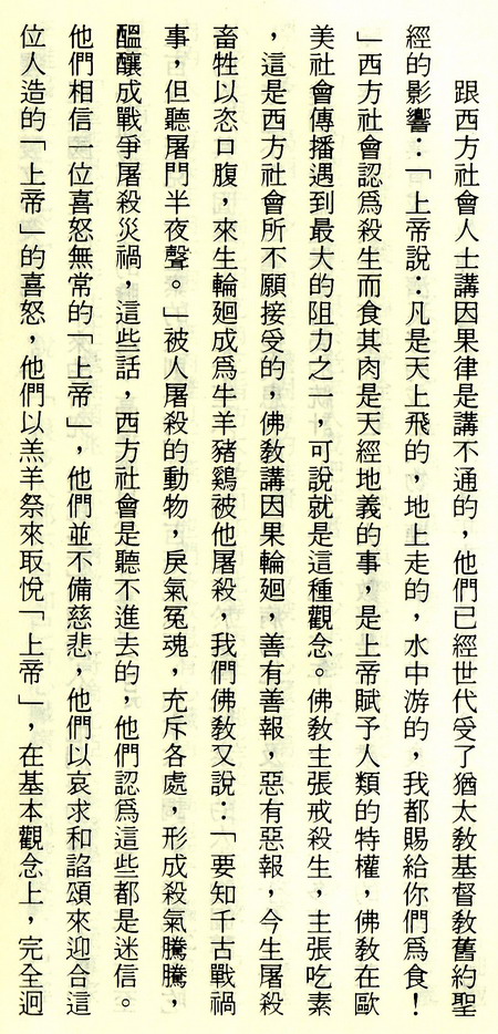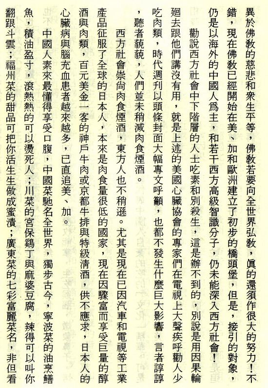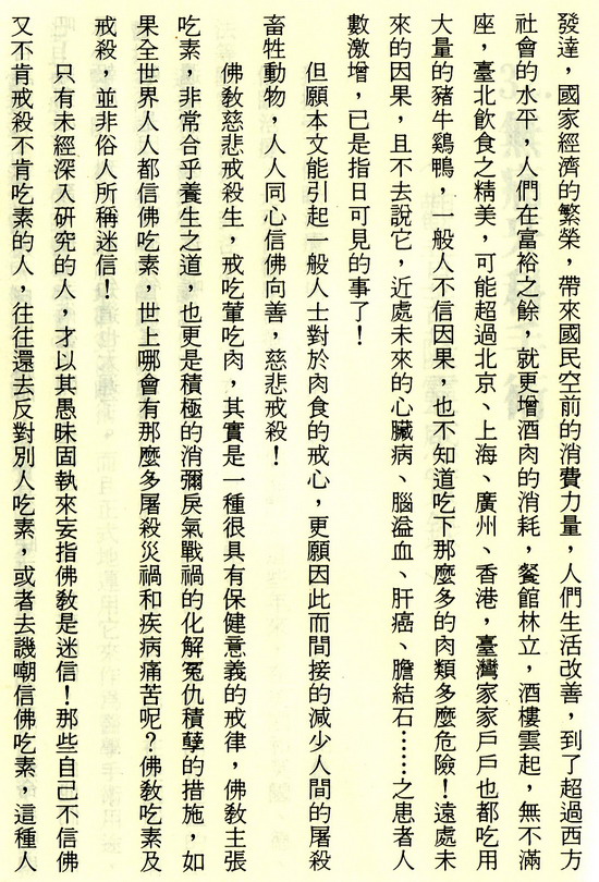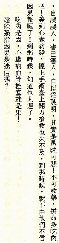 “美國心臟保健協會”(AHA)多年來不斷呼籲社會人士將煙酒肉食的生活習慣改革,最好實行素食,但是一般人大多數不甚重視這種呼聲,依然是縱情食肉飲酒吸煙,事業成功的人不用說都是日日宴會,酒食徵逐,就是收入不豐的人,也競相以食肉飲酒爲生活的最大享受。窮人吃不起大牛排,也得吃碎牛肉餅,殊不知那些便宜的碎牛肉,根本就是牛筋牛脂與一些零碎殘肉絞成的,所含脂肪高達百分之六十,再經過油煎,飽和脂肪度高達百分之八十,吃下去,日積月累,形成了血管栓塞,心臟病,腦充血,加速走向墳墓,一元一份的口口口炸牛肉夾 麵包,公司賺了幾百億元,卻害死了百千萬計的窮人和小孩子,就更別說這些公司屠殺了多少千千萬萬頭牛羊,殺孽深重,種下多少惡因。