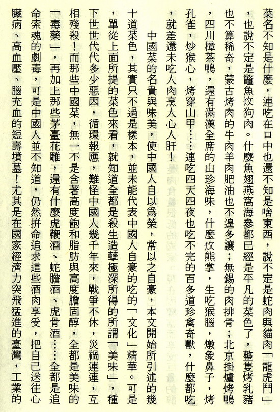 “雞茸燕窩羹;當紅炸子雞;羅漢扒大鴨;帶子時菜;海參冬菇;八珍燴蠔;蟹肉菜膽;清蒸海鮮;京都排骨;雞片雪兒羹;蟹肉扒菜膽;北菇蒸滑雞;甜酸咕嚕肉;明蝦大沙津;雞茸燴燕窩;北京掛爐鴨;五香椒塩雞。” 夠了,我越看越難過,越心驚,這些所謂名菜,都是有害無益的高度脂肪、高度膽固醇、高度蛋白質,都是導致心臟病、血管栓塞與腦血管栓塞的有毒物質呀!又再佐以美酒,什麼茅臺、花雕、白蘭地、威士忌,簡直就是自殺! 難怪那麼多人患高血壓與心臟病、膽結石!人們吃肉喝酒,只道是美味享受,哪知是自殺? 有些人更不以吃肉爲足,還要用名酒、藥材燉豬腦牛腦,吃蛇膽,吃鹿茸,以爲進補壯陽滋陰,殊不知,豬腦牛腦所含的高度膽固醇最多,蛇膽含的膽固醇更高,這些毒物,吃進人體,都成為血管內的膽固醇及游離脂肪片,堆塞了血管內壁,終於形成血管閉塞不通,心臟病發,心肌奇痛,至於停頓,或者腦血管栓塞,輕則“中風”半身不遂,重則死亡。