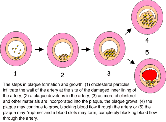 第一期,肉類的游離脂肪薄片,及膽固醇微粒,在人體動脈血管內隨血液流動,遇到有些或因新陳代謝或因傷損而脫落的血管內壁內皮空隙,它就沉澱積聚。 第二期:血管內壁更內層的“大食細胞”(白血球之一種),及血液中的血小板,兩者互相積聚起來,堆於傷損的血管內壁。“大食細胞”吞吃那些沉澱的膽固醇及飽和脂肪,逐漸形成脂肪小球。 第三期:血管壁內的肌肉細胞向血管內通道推進,越生越厚,漸漸隆起阻塞了血管,終於引起血液難以流通,血流狹窄,形成高血壓。