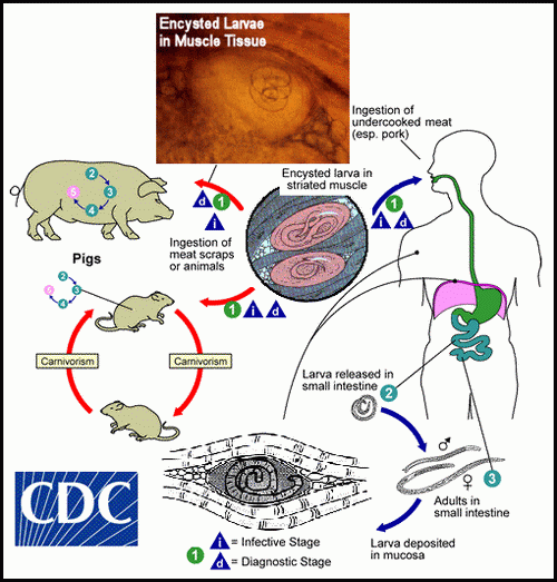 動物肉類還常常含有很多寄生蟲,因為畜類禽類所過的生活,都是很不衛生的。豬住在豬圈內,一身泥槳糞尿,吃的是殘食與垃圾,又喜歡在泥潭中打滾,它一身染滿了病菌,又從汙穢泥濘中傳染得到蛔蟲病。吃豬肉是很可能把蛔蟲卵吃進肚子的。豬牛肉也常有旋毛蟲,那是潛伏在草地的泥土中的,它的幼蟲隨著草給動物吃進肚子,再進入了動物的小腸,轉入活動最多的肌肉,例如牛舌頭、牛腿肉、橫膈膜、豬腸、豬肝……。吃豬肉、牛肉及其內臟,實在是很危險的事!因為旋毛蟲能耐高熱,不是一般烹飪溫度所能殺死的。旋毛蟲給吃進人體,那就不得了!除了旋毛蟲、蛔蟲,還有帶蟲等等寄生蟲,都是有害於人體的。