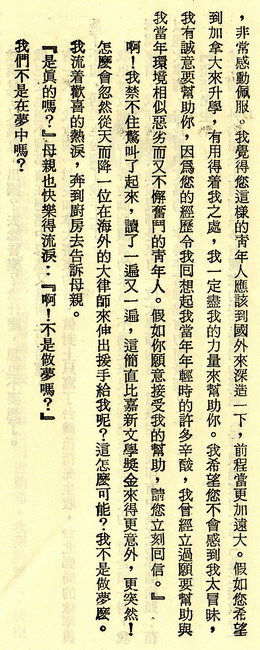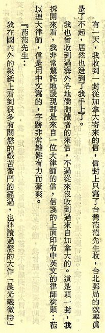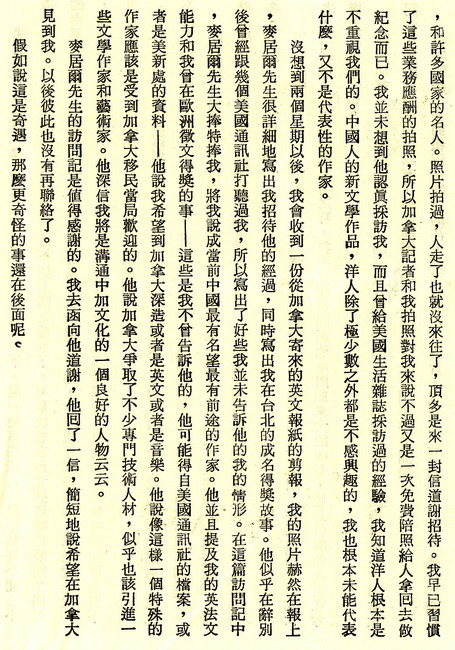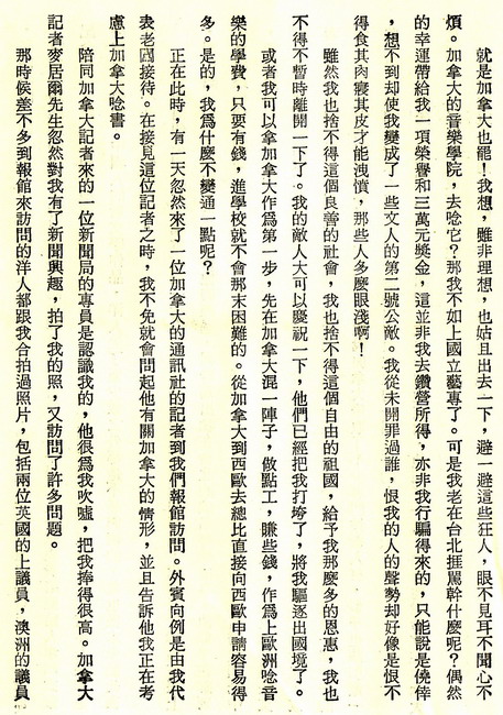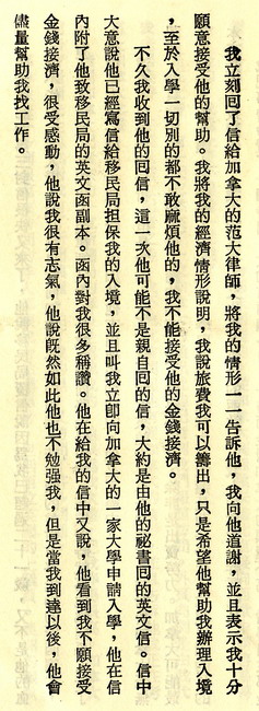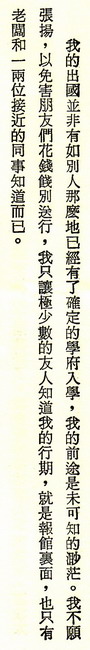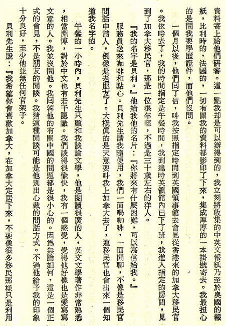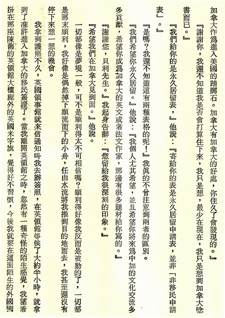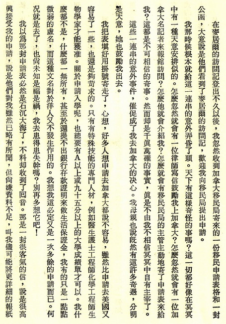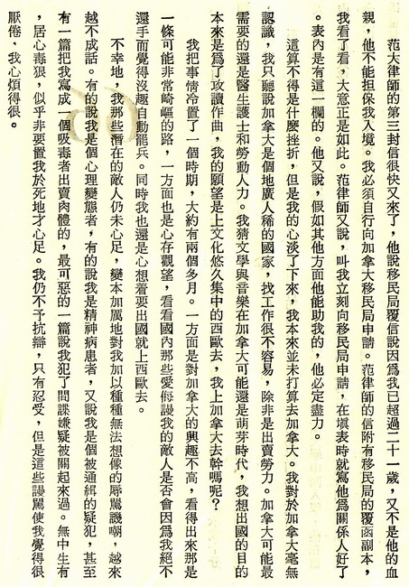 網註:此書寫於1980年,馮馮尚無意公開早年遭遇,故文中未透露懼於情治局拘捕投獄的危險而離開臺灣。提及「拿到護照」與「辭職赴加」,與持往加拿大的護照影印本及王惕吾社長的推薦信吻合。