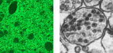 | Left picture shows rich presence of dopamine-containing nerve endings (green dots) in the basal ganglia of a rat brain, visualized by fluorescence microscopy. To the right, a close-up of one nerve ending as seen in the electron microscope. The black dots in the vesicles represent stored dopamine. |
