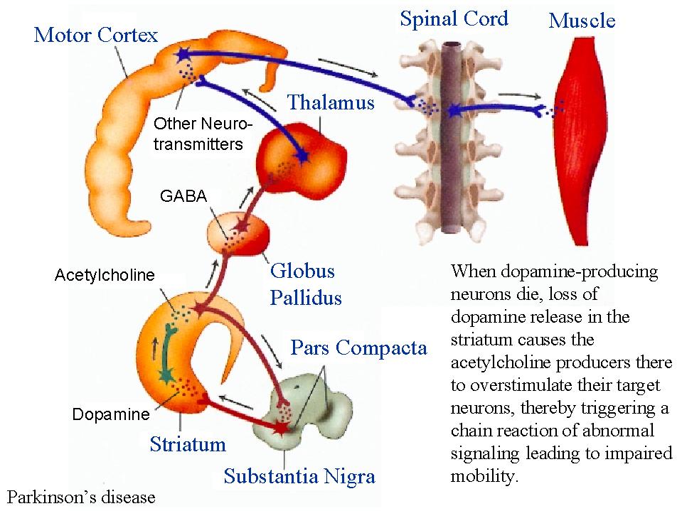 | Causes There are several theories about the cause of PD. We believe that in most cases Parkinsonism is a result of the death of the dopaminergic cells in the substantia nigra. Studies show that parkinson's patients have a loss of 80% or more of the dopaminergic cells in their substantia nigra. There is also a theory that associates this cell death with the presence of free radicals in the brain that could destroy these dopaminergic neurons. For example, studies confirm higher brain levels of iron and lower levels of ferritin in the brain, indicating oxidation. Some scientists also link the neuronal death in the substantia nigra to the presence of a single toxin, like MPTP. |