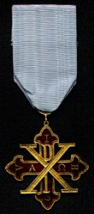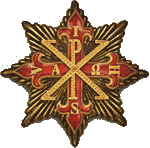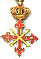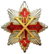The Cross of the Sacred Military Constantinian Order of Saint George is gold, flory, enameled in purple; of greek form, inscribed on the four arms with the letters I H S V (In Hoc Signo Vinces) and in the centre has the monogram PX with greek letters Alpha and Omega either side.