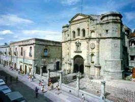 La fachada del templo se empezó a construir a principios del siglo XVII y es de estilo renacentista con inicios del barroco. En la parte superior se encuentra el escudo de la orden dominica y los símbolos de la fe, la esperanza y la caridad. Las torres del templo se terminaron en 1660 y tienen una altura de 35 metros.