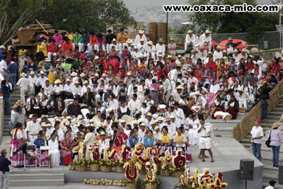 La Guelaguetza de los Lunes del Cerro se expresa en la ofrenda a la Ciudad de Oaxaca que hacen grupos representativos de las siete regiones tradicionales: