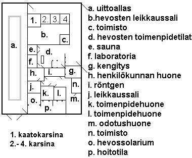 Pohjapiirrustuksesta näet millaisissa tiloissa toimimme. Käytössämme olevissa tiloissa on mm. 20x3m uittoallas, hevosten ja pieneläinten leikkaussalit, pieneläinten röntgen, hevossolarium... Hierontoihin ja muihin hoitoihin otamme yhden tunnin aikana korkeintaan kaksi hevosta.
