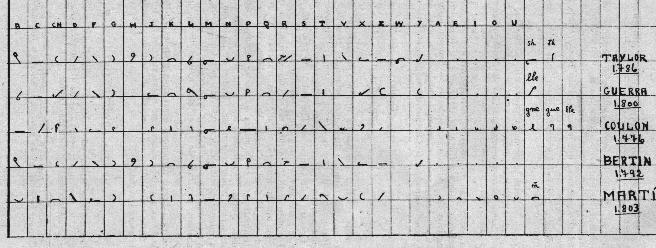 El sistema, formado por 16 signos alfabéticos, uno inicial y seis terminaciones, apenas se diferencia del de Taylor. Estos signos sirven para una cantidad de finales cuyos sonidos son parecidos. Las abreviaciones consisten en la supresión de letras o la reducción de una palabra a su inicial.