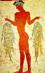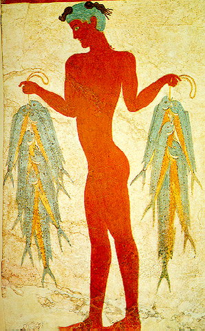 Akrotiri was an urban centre with 2 and 3 storey buildings, mostly residential and all decorated with wall paintings. Typically the ground floors and basements housed mills and grinders, workshops and store rooms, a kitchen and bath tub. To keep them cool, the rooms had a few small windows. Impressive staircases of stone or timber led to the upper stories. The walls were prepared for painting by smoothing with clay and broken straw and coating with plaster which was polished with pebbles. The paintings show men fishing and women gathering saffron. The men wore a loin cloth and the women, long flowing skirts, short sleeved bodices and necklaces, bracelets and earrings of gold, rock crystal and gemstones
