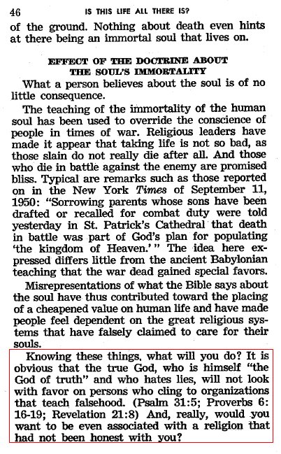 It is obvious that the true God, who is himself "the God of truth" and who hates lies, will not look with favor on persons who cling to organizations that teach falsehood. (Psalm 31:5; Proverbs 6:16-19; Revelation 21:8) And, really, would you want to be even associated with a religion that had not been honest with you? –Is This Life All There Is?, 1974, page 46.view
