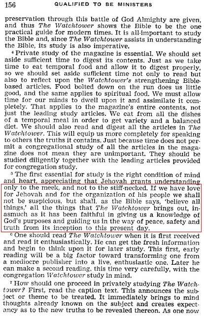 If we have love for Jehovah and for the organization of his people we shall not be suspicious, but shall, as the Bible says, 'believe all things,' all the things that The Watchtower brings out, in as much as it has been faithful in giving us knowledge of God's purposes... –Qualified to be Ministers, 1955, page 156.view