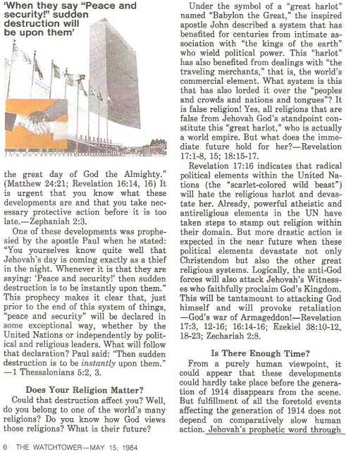 But Jesus added something very significant about the generation of 1914. What was it? He said: "When you see these things occurring, know that the kingdom of God is near. Truly I say to you, This generation will by no means pass away until all things occur." –The Watchtower, May 15, 1984, page 4.