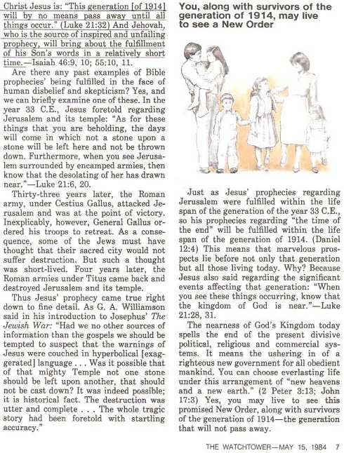 Jehovah's prophetic word through Christ Jesus is: "This generation [of 1914] will by no means pass away until all things occur." (Luke 21:32) And Jehovah, who is the source of inspired and unfailing prophecy, will bring about the fulfillment...2 –The Watchtower, May 15, 1984, page 6-7.view view