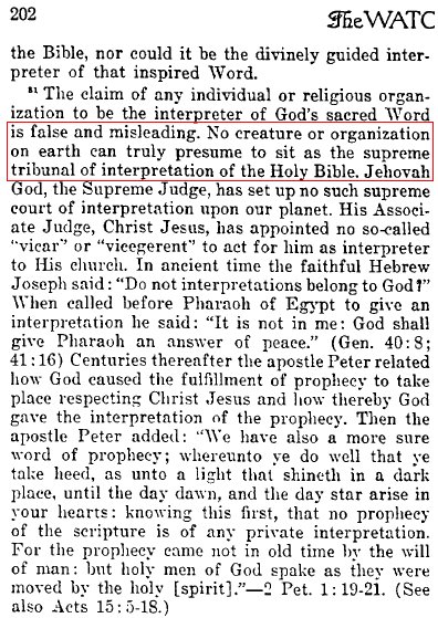 No creature or organization on earth can truly presume to sit as the supreme tribunal of interpretation of the holy bible. –The Watchtower, July 1, 1943, page 202.view
