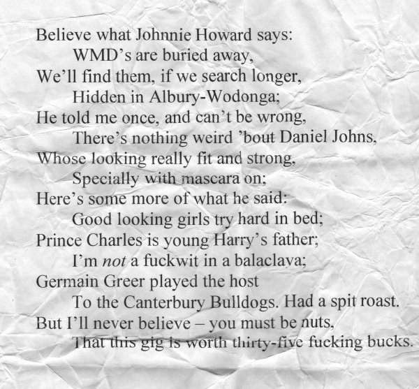Image (88kb) of the diatribe performed at the TISM Idol shows in 2004. Thanks to Fleur for this!