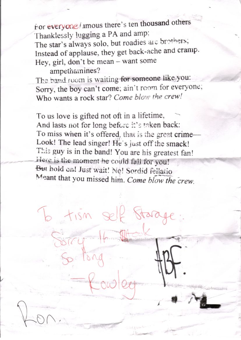 Image (115kb) of the heartwarming tribute to roadies performed at the Tote secret gig in 2004. Molto thanks to Rowland Melville, the fan who gets onstage on the DVD, for passing this on. Note autographs!