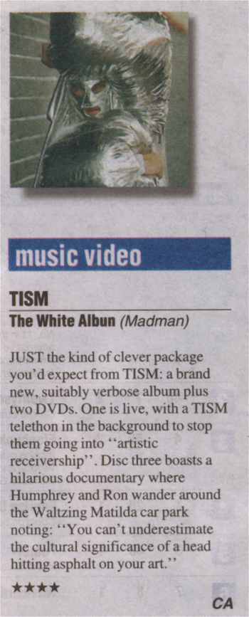 Michael Dwyer's interview in the Age EG is a refreshingly honest take on the TISM phenomenon - "I only know what I object to personally, which is the abrasive texture of their music. I don't like relentless programmed beats at the best of times. Especially when there's so much shouting involved." (external link)