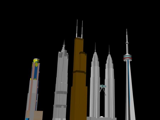 | Baiyoke 2 in the shadow of other world skyscrapers (from left to right: Baiyoke2, Jin Mao, Sears, Petronas, CN tower) |