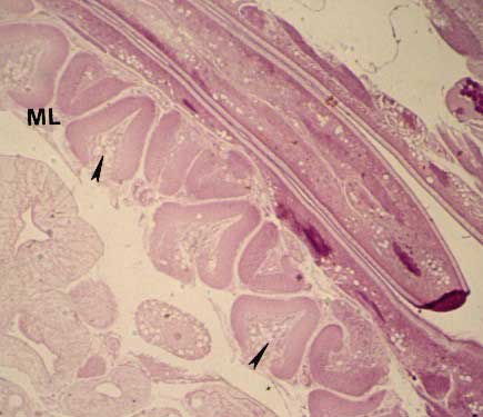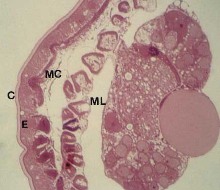 C: cuticola; E: epitelio; MC: fibre circolari; ML: fibre longitudinali.