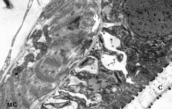 In questa immagine al microscopio elettronico sono visibili: la cuticola (C), l'epitelio (E) al di sotto dei quali si trova una fibra platimiaria dello strato circolare.