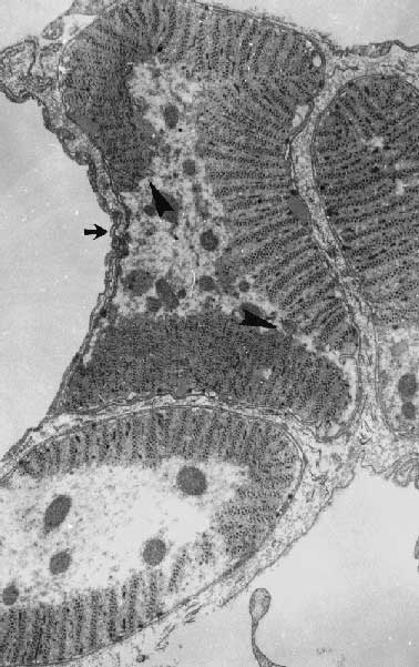 Fibre poliplatimiarie dello strato longitudinale.Il materiale contrattile � a blocchi. Lo strato � delimitato da un sottile epitelio (freccia).