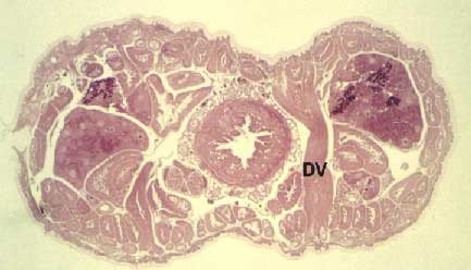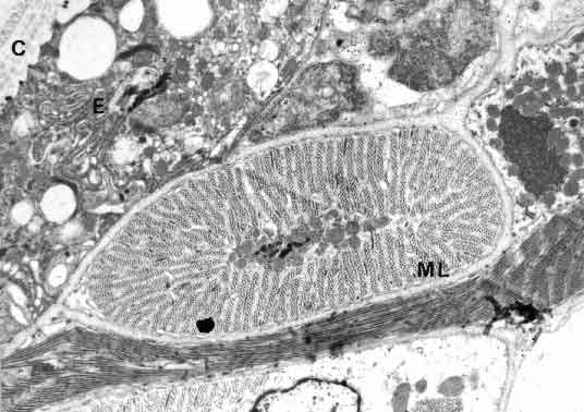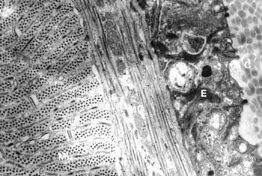 Sezione trasversale al microscopio elettronico: C- cuticola; E- epitelio; MC- muscoli circolari; ML- muscoli longitudinali.