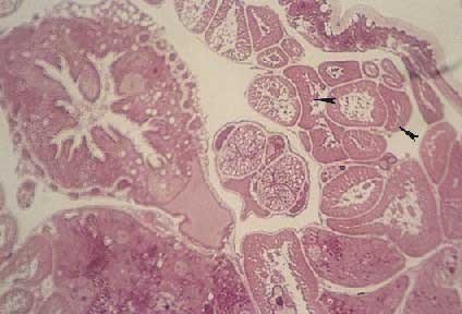 A maggiore ingrandimento si notano fibre circomiarie cilindriche e pseudocircomiarie (frecce).