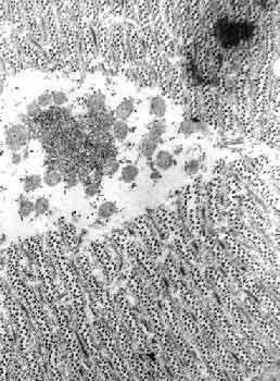 Fibra circomiaria cilindrica con asse citoplasmatico occupato da piccoli mitocondri.