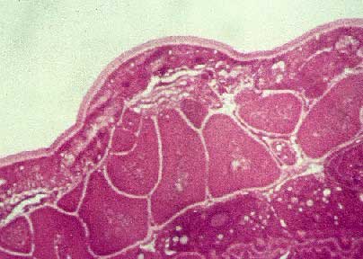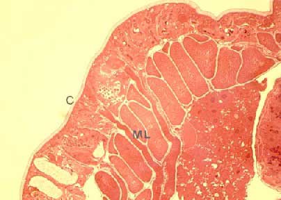 Sotto a cuticola ed epitelio � visibile lo speso strato longitudinale composto da cellulle grandi e piccole incuneate.