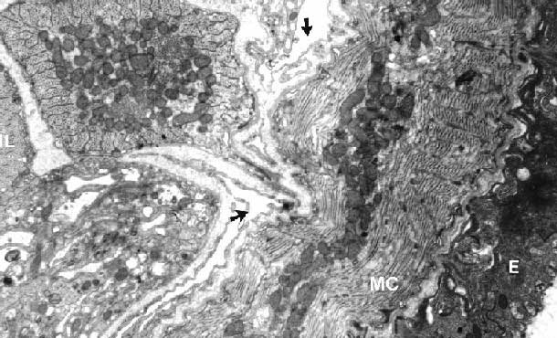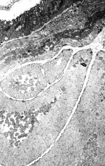 Al microscopio elettronico sono visibili epitelio (E), una fibra circolare (MC) e fibre longitudinali (ML).