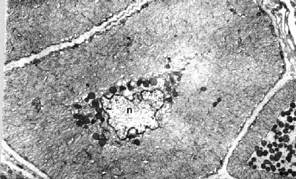 E- epitelio; MC- fibre circolari; n- nucleo; le frecce indicano gli esigui spazi intermuscolari.