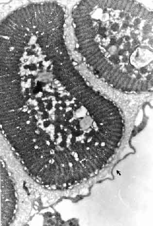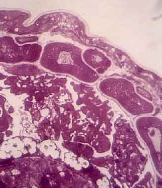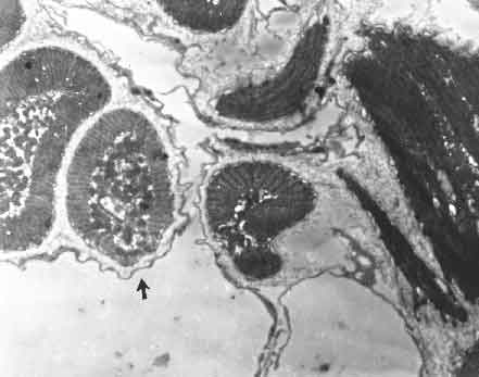 Sezione trasversale di fibre circomiarie cilindriche: � evidente il rivestimento dello spazio intermuscolare.