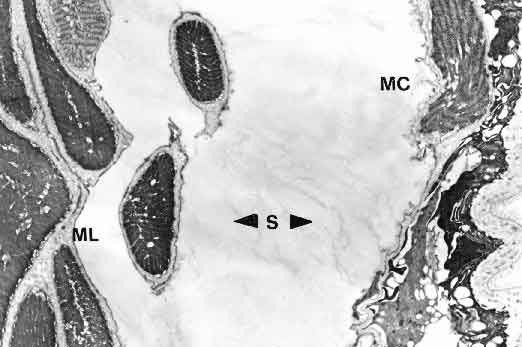 C- cuticola; MC- muscolatura circolare; ML- muscolatura longitudinale; S- spazio intermuscolare.