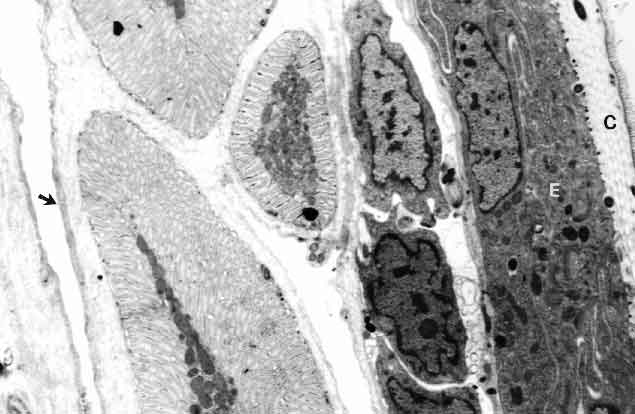 Sono visibili: cuticola(C), epitelio (E) e muscoli longitudinali.