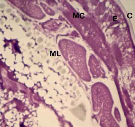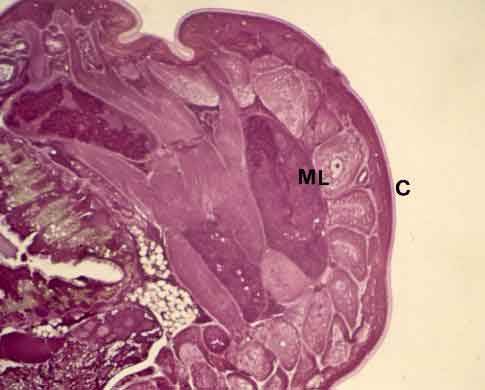C: cuticola; E: epitelio; ML: strato muscolare longitudinale.
