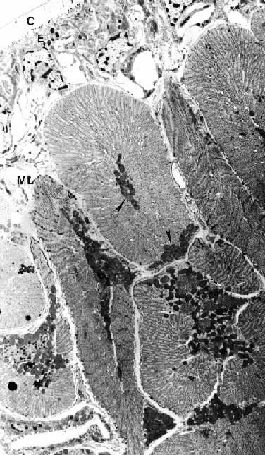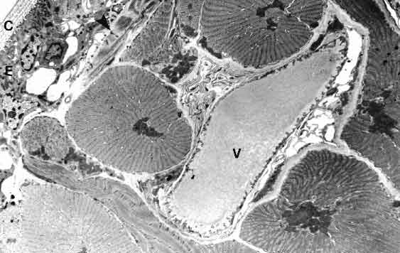 C- cuticola; E- eptelio V- vaso. Le fibre longitudinali sono circomiarie cilindriche, quelle circolari sono discontinue.