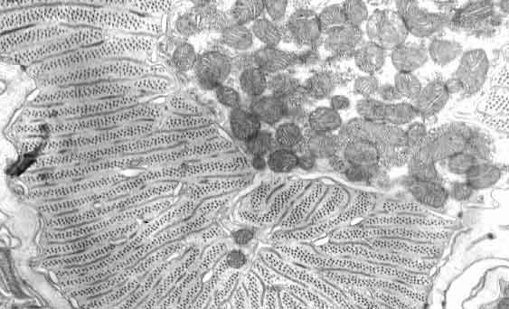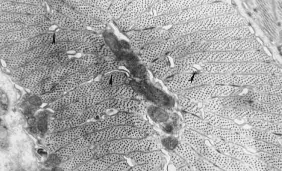 Nella sezione trasversale di questa fibra circolare sono evidenti le diadi sparse nel materiale contrattile.
