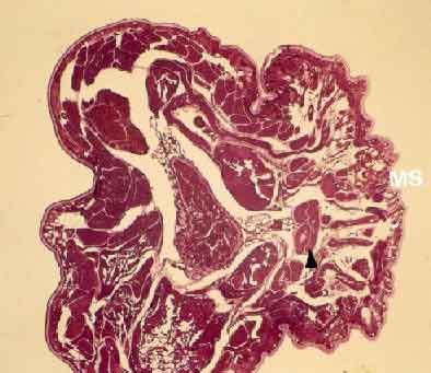 Sezione trasversale di Magmatodrilus a livello di una cresta. Sono presenti muscoli soprannumerari (MS) e gli strati di fibre circomiarie.