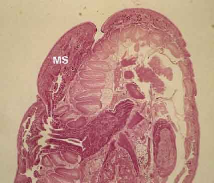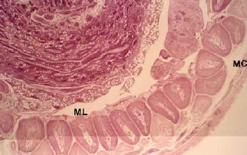 Sotto all'epitelio sono visibili i muscoli soprannumerari (MS) i muscoli circolari (MC) e quelli longitudinali (ML).